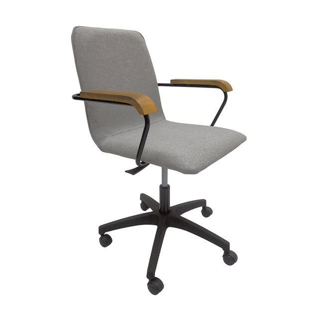 Poltrona com concha de multilaminado de 15mm. Base giratória injetada em Nylon poliamida 6.6 na cor preta e 5 hastes equidistantes a 72° e raio de 300 mm, reforçadas com aletas estruturais para aumentar a resistência a cargas estáticas aplicadas. Alavanca regulagem pneumática de altura, com ponteira injetada em polipropileno 100% reciclável e haste em aço de 8 mm. Haste central pressurizada, que propicia suavidade de amortecimento sem o uso de molas, curso de regulagem de 100 mm, confeccionada em aço SAE 1045 e com conificação tipo Morse (1°26') na parte superior para encaixe no suporte de fixação do assento da cadeira. Pistão classe 3. Apoio de braço com formato ergonômico, estrutura de aço carbono tubular de ½ polegada e parede interna de 1,2mm solda mig e pintura epóxi, apoio em madeira de reflorestamento 100% eucalipto. Estofado composto por espua de alta densidade D-28 de 4cm no assento e D-26 DE 3cm no encosto revestida com manta de fibra 250 gramas, acabamento em tecido, fixado por meio de grampos em aço carbono bitola 80/08.