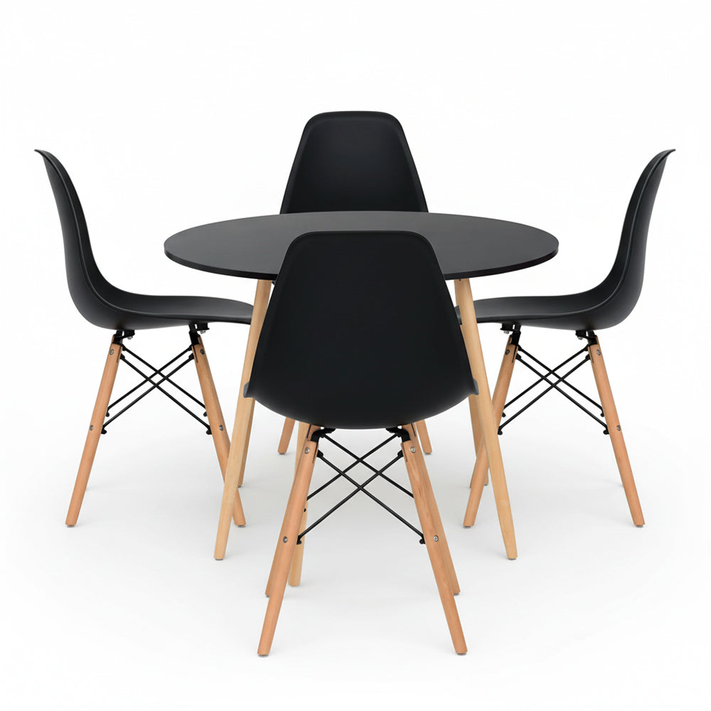 A mesa possui tampo resistente de 25 mm e 100 cm de diâmetro, oferecendo excelente espaço para uso individual ou compartilhado. Já as quatro cadeiras possuem estrutura fixa palito em polipropileno, garantindo leveza, resistência e fácil manutenção — ideal para rotinas intensas.