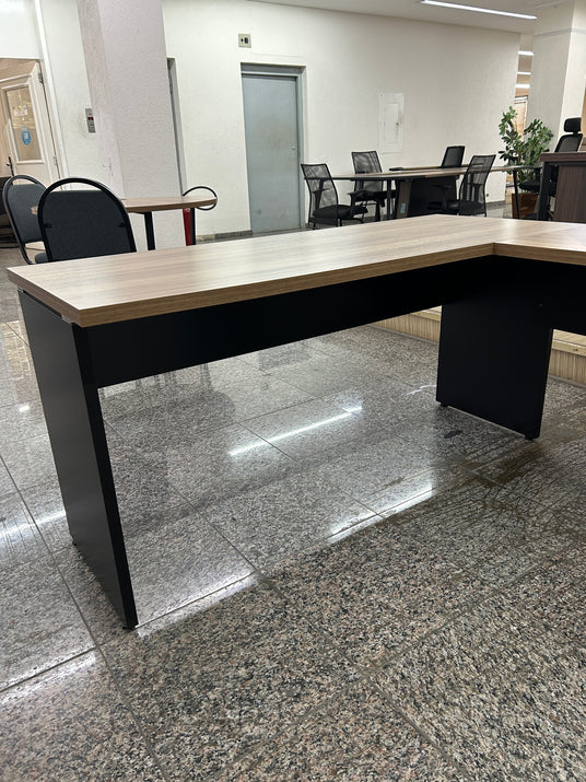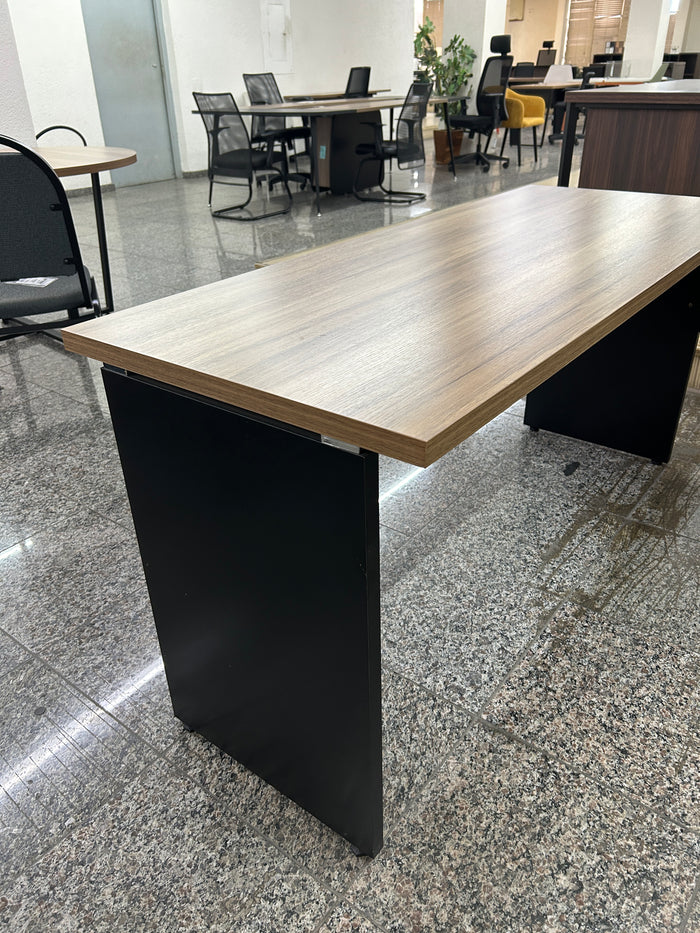 Com medidas de 73,5 cm de altura, 150 cm de largura e 60 cm de profundidade, oferece amplo espaço de trabalho e se adapta facilmente a diferentes layouts de escritórios e salas de diretoria. O sistema de montagem com buchas metálicas e sapatas niveladoras garante estabilidade e facilita o transporte e a montagem.