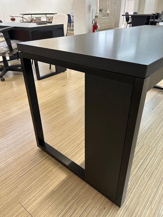 O tampo é encabeçamento em todos os topos com fita borda PVC 1 mm. Pé quadro composto pela união de tubos 30x50x0.9mm sendo na parte inferior e nas laterais e na parte superior o tubo 25x25x0.9mm, assim se tornando um quadro, a união deles se dá pela fixação de solda MIG. Todos os aços são fina frio SAE1008. Pintura eletrostática em epóxi, espessura mínima de 40 mícrons. Na parte interna do pé quadro é fixado um painel lateral em MDP 25 mm com acabamento em ambas as faces, com laminado melamínico de baixa pressão (BP).